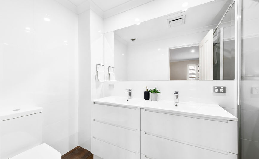 - master ensuite with sleek modern bathroom with full height tiling, twin vanities, shower and WC