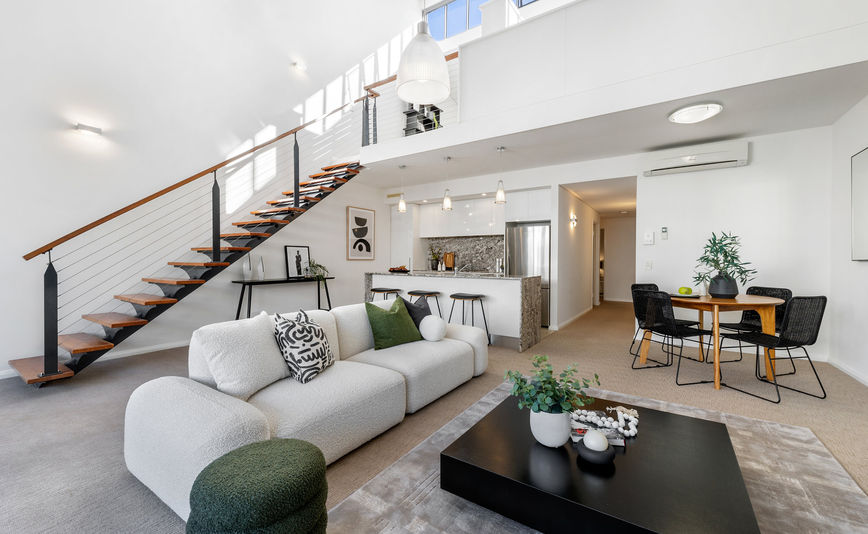 Contemporary living spaces spanning 159sqm (approx.) define this bright 2-level apartment basking in brilliant natural north light. Enjoying the vitality of a sensational old inner-Perth location, this expansive urban space is spatially seductive with its sprawling open-plan layout lined by a bank of north-facing sliding doors.